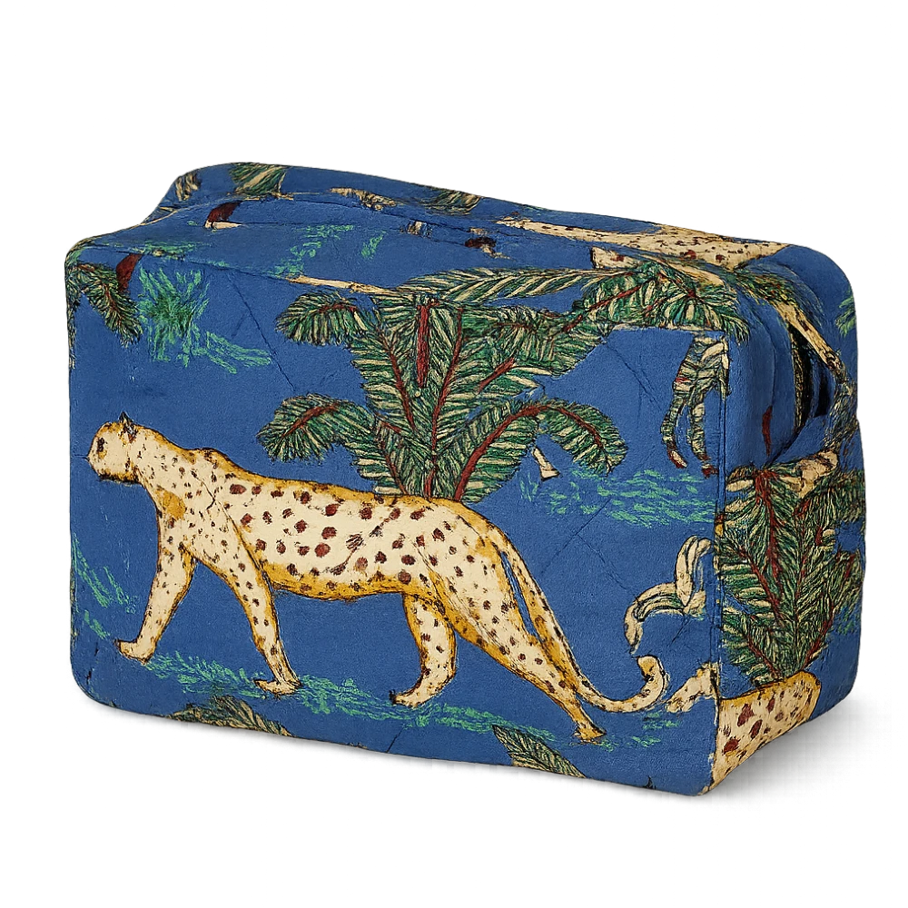 Fabulous hand printed blue jungle fabric toiletry bag aka wash bag, drop kit or make-up bag.