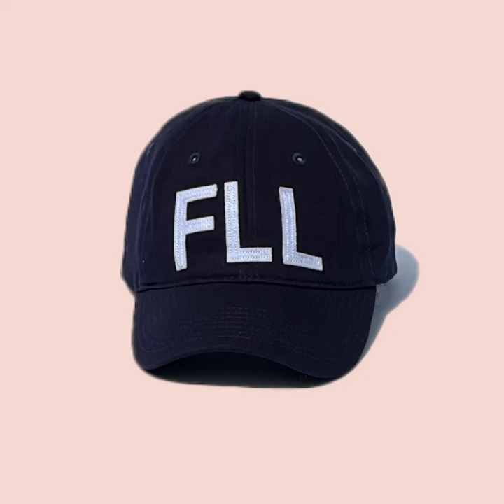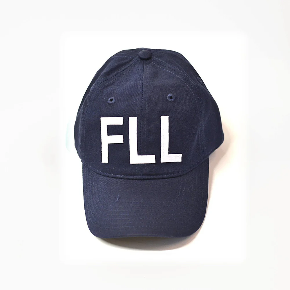 White three-letter airport code on navy baseball cap-symbol of Fort Lauderdale International.