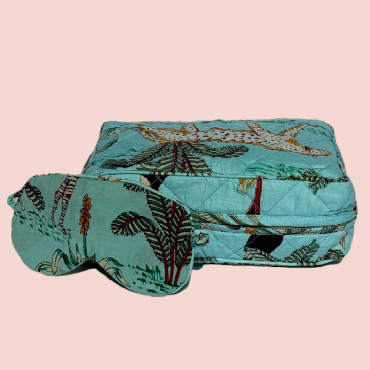 Fair trade hand printed fabric wash bag large enough to carry more than the usual Ziploc bag you grab when it’s time to travel. Pair with coordinating sleep mask and really give the appearance of adulting.
