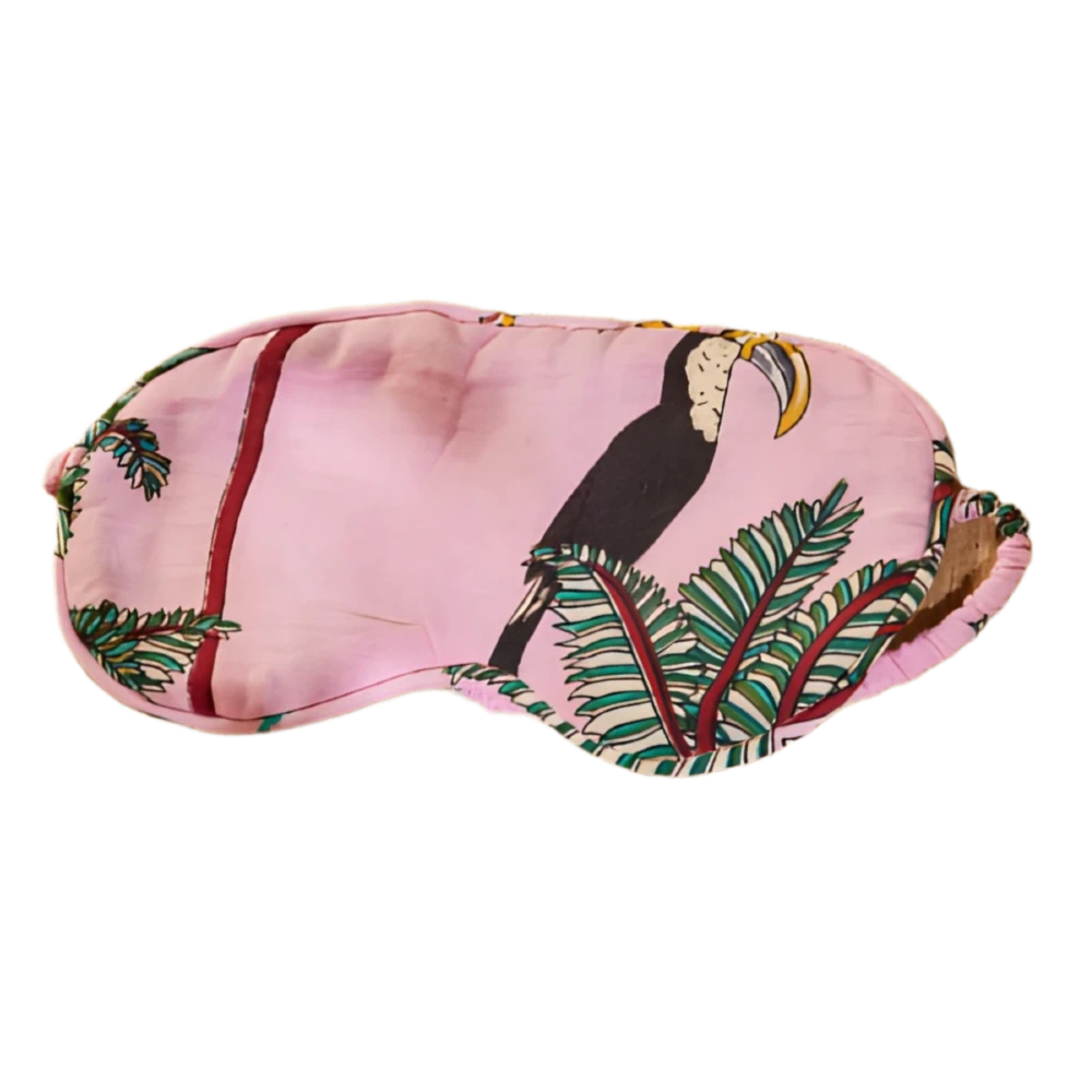 Soft cotton blackout eye mask, hand screen printed in an exotic pink jungle fabric.
