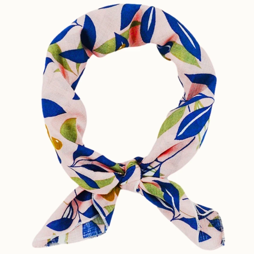 Neckerchiefs are lightweight and smaller than a traditional scarf. She’s a scarf and bandana morphed into one. Neckies are a great alternative to warmer weather when you still want a put together look. Soft Pink with Navy, Light Green, & Harvest Gold.